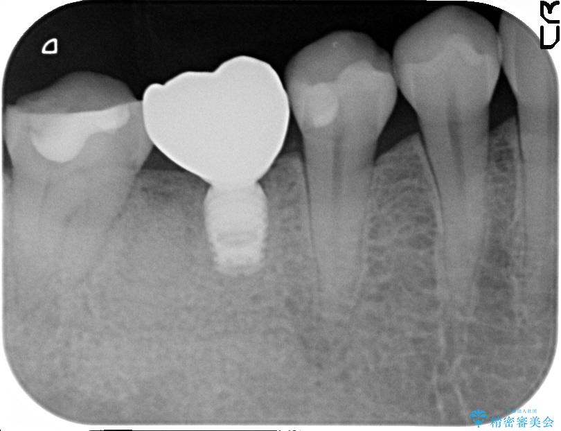 抜歯を行った当日に骨の維持をする為、人工の骨を充填しました。インプラントを埋入する際には、ほとんどが自分の骨に置き換わっており、頬舌的なへこみを引き起こす事もなく、審美性・機能性ともに維持する事が出来ました。