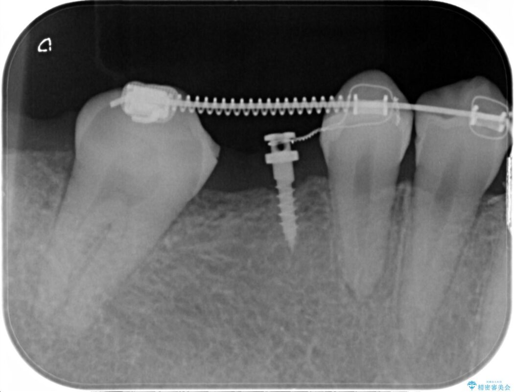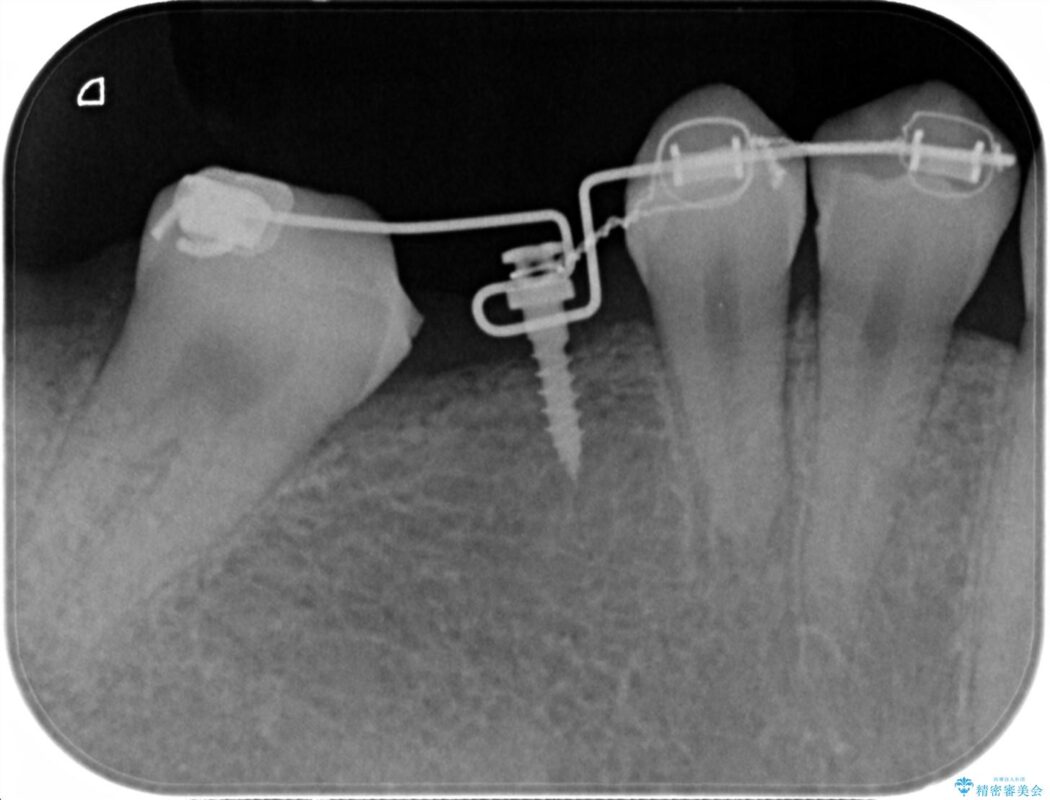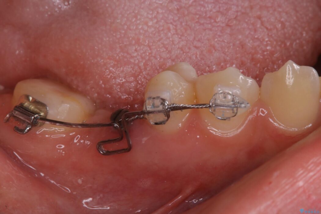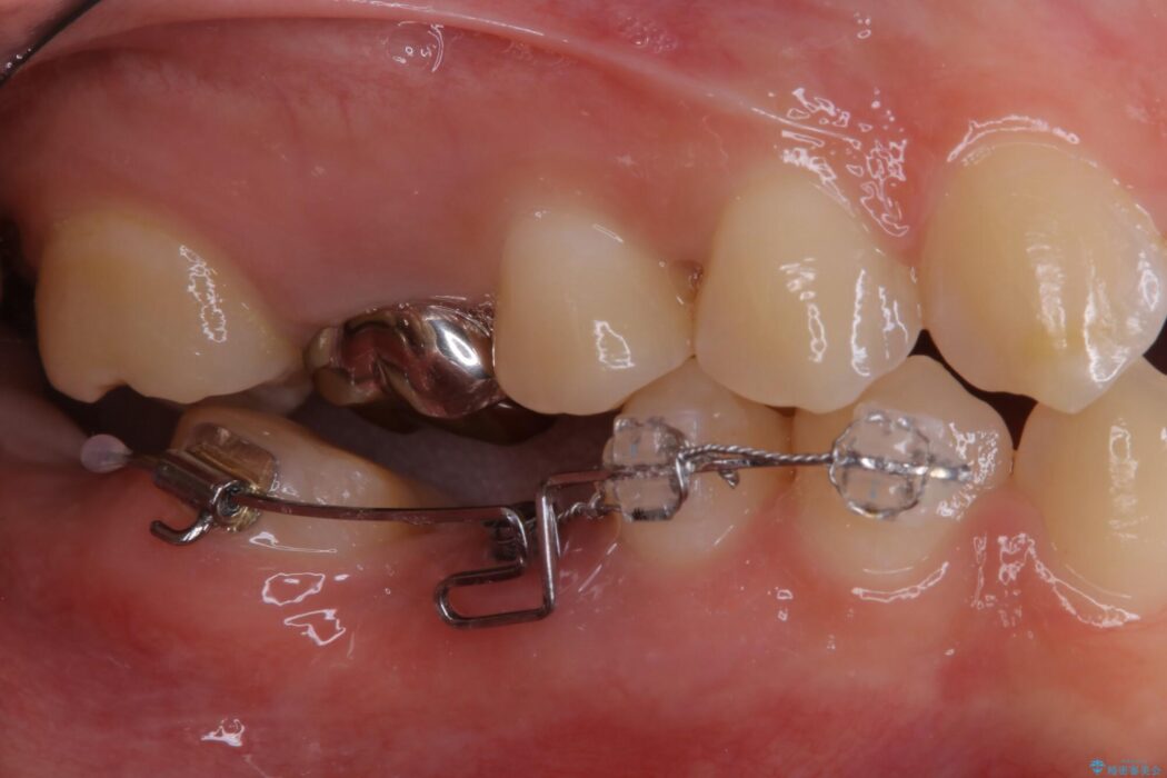 この状態のままブリッジ治療へと進んでしまうと神経が露出する可能性が否定できないため、まずワイヤー装置による部分矯正で歯軸を通常位置へ戻してから補綴治療を行うこととしました。