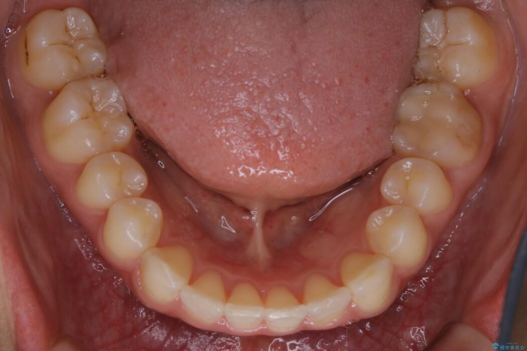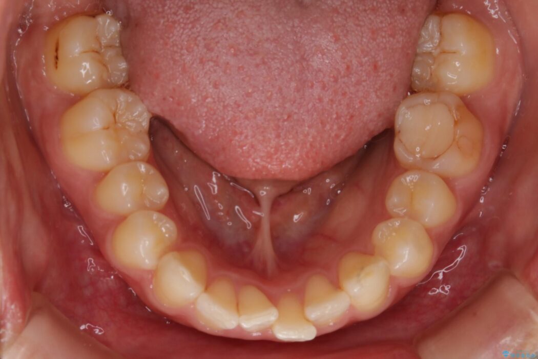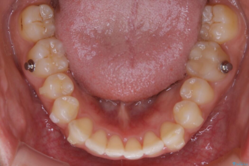 本症例では下顎の歯列が舌側へ傾くことにより幅が狭まっていましたので、マウスピース治療により歯列弓を拡大しました。