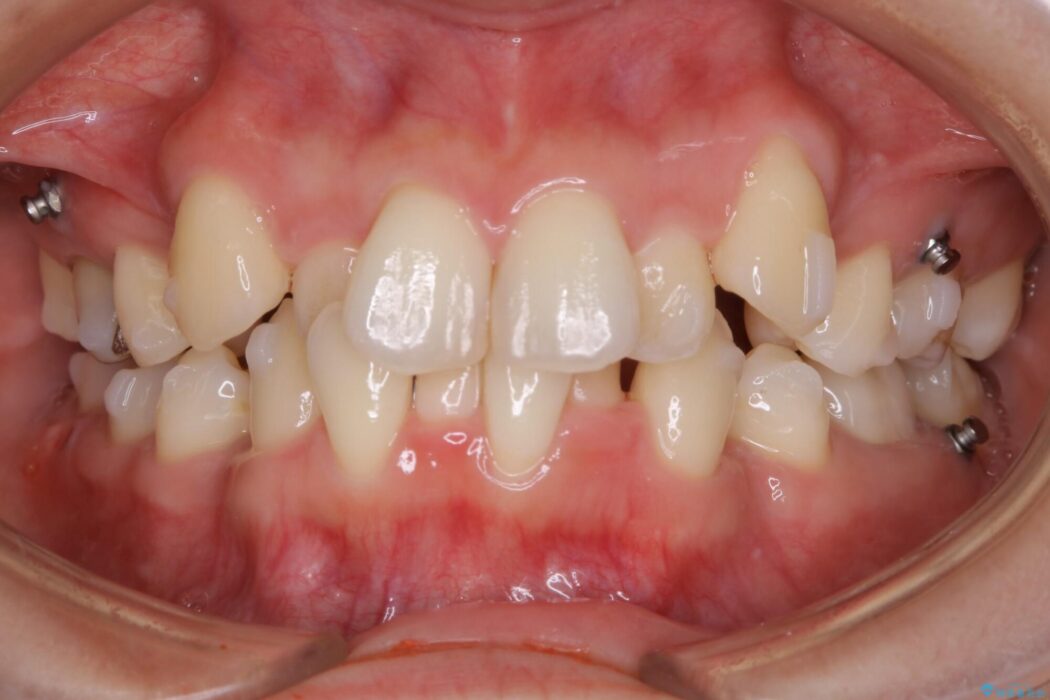 まず噛み合わせに問題が少ない奥歯の位置を極力変えないように上下左右4番目の歯を抜歯することで歯列矯正のためのスペースを確保し、空いた隙間で前歯の凹凸をきれいに並べていくこととしました。
