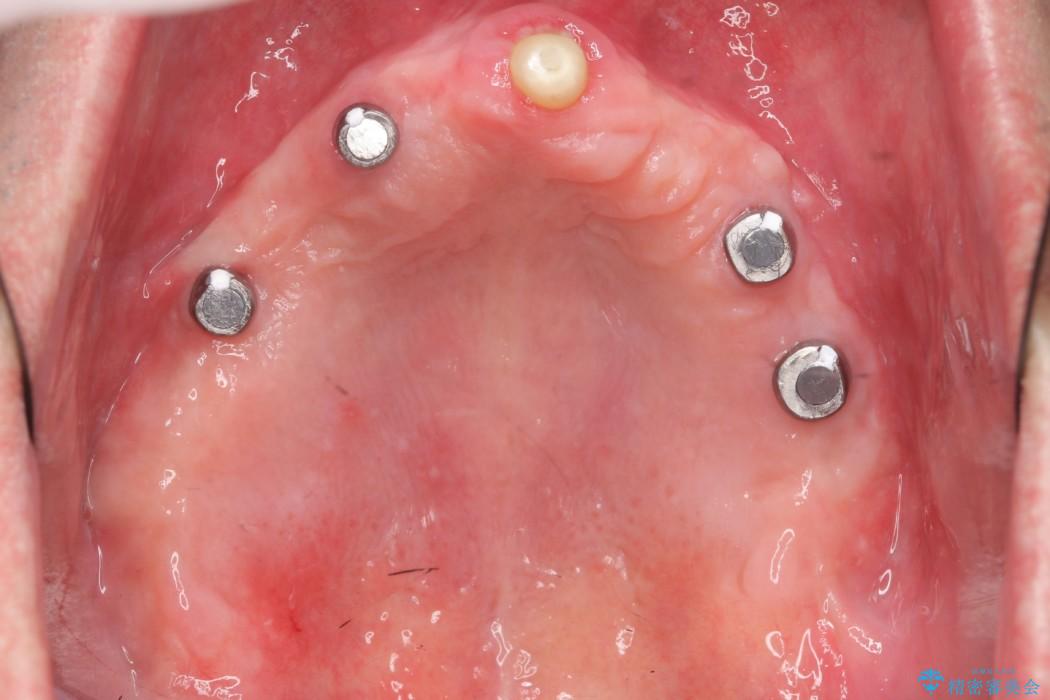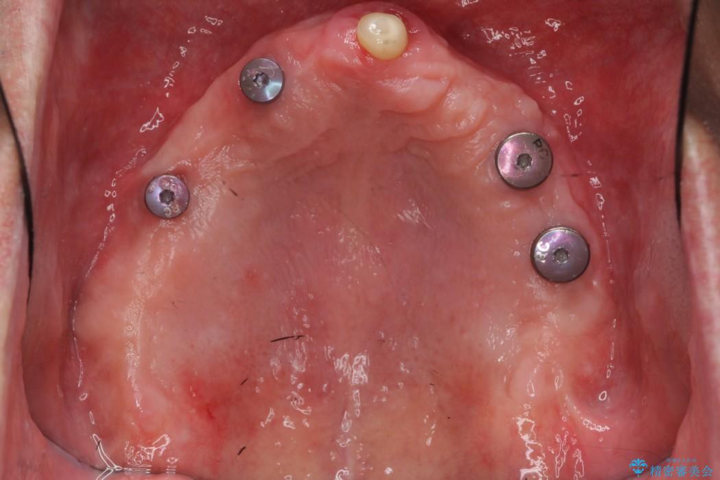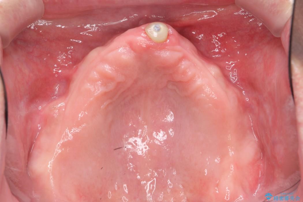 状態から残せないと判断した歯を抜歯、噛み合わせ回復のため土台にインプラントを用いた上顎義歯にて補綴治療をすることとしました。