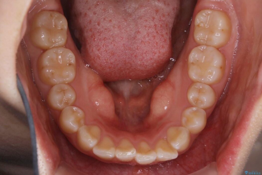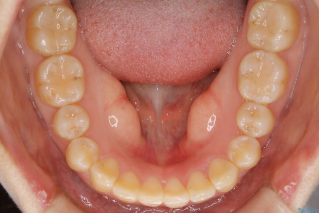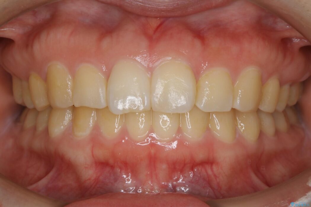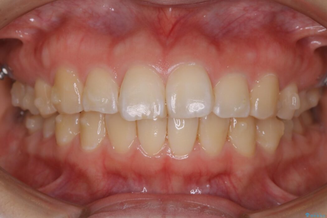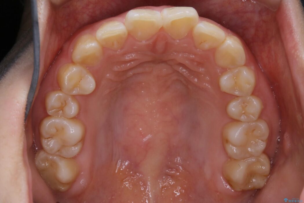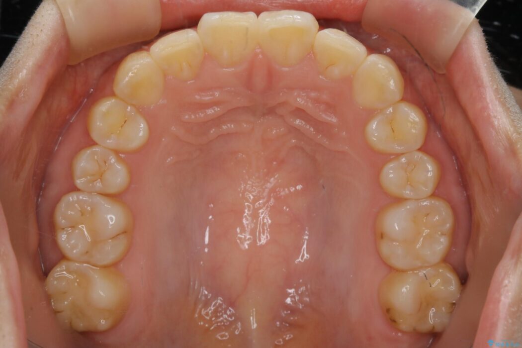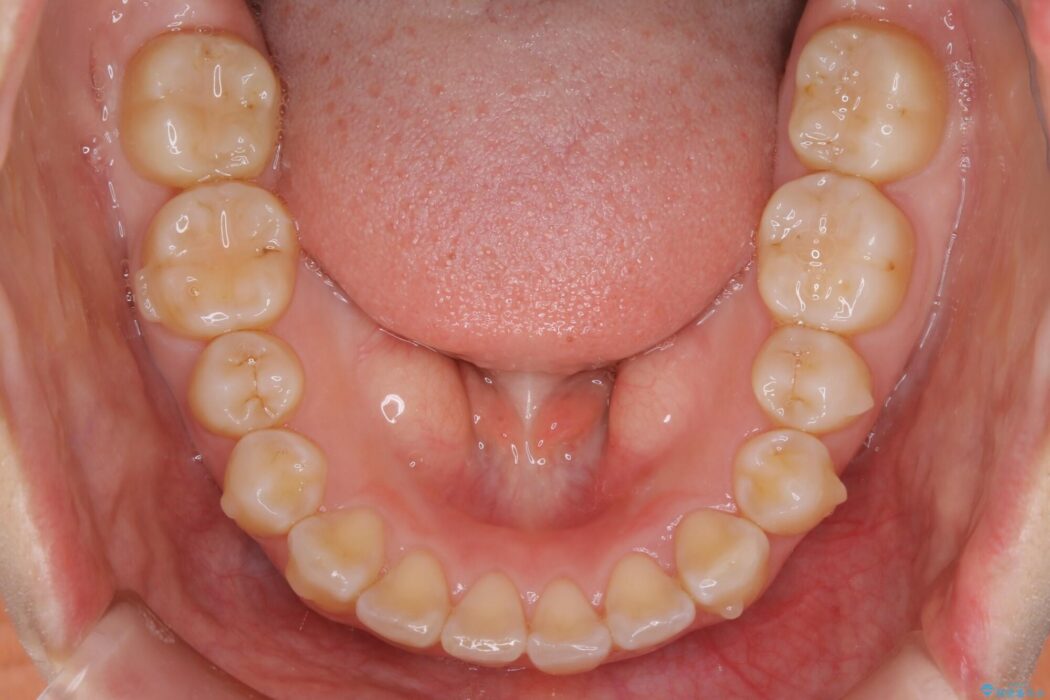 歯軸傾斜と軽度の叢生が見られましたので、通常の位置へと傾きを戻し少量の遠心移動に加えアーチ(歯列弓)の拡大とIPRを施すことで改善していく非抜歯での治療計画としました。