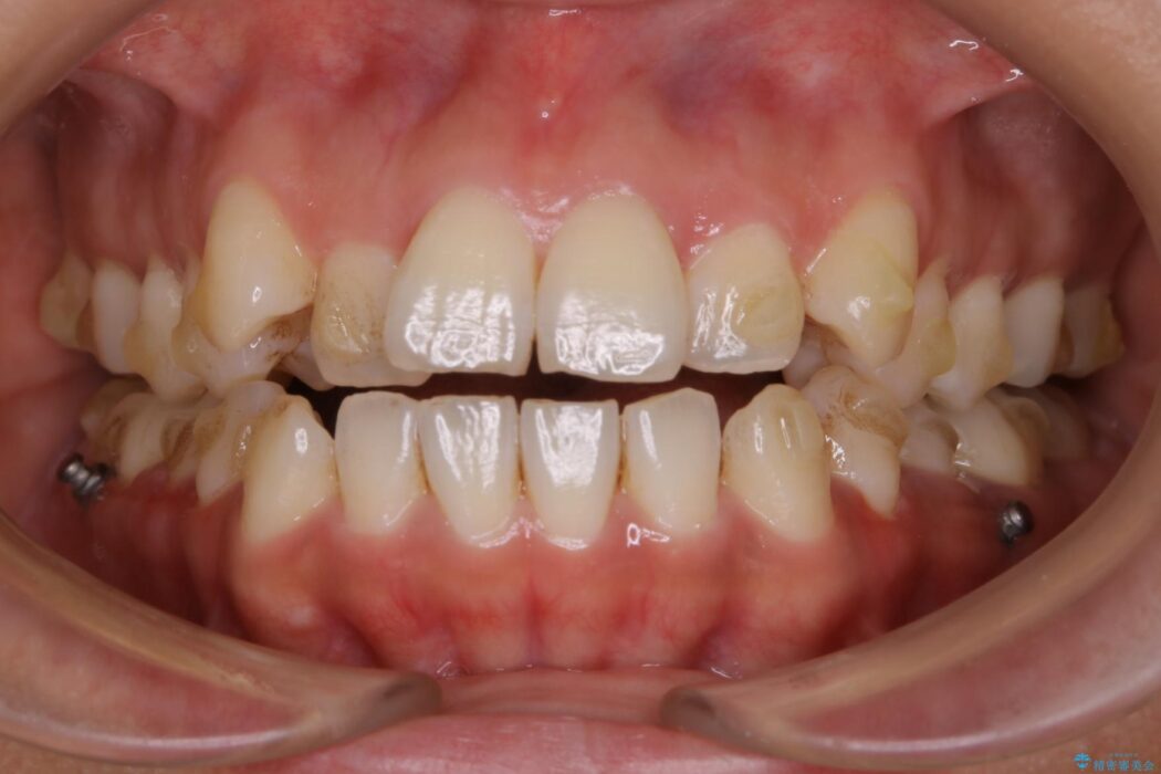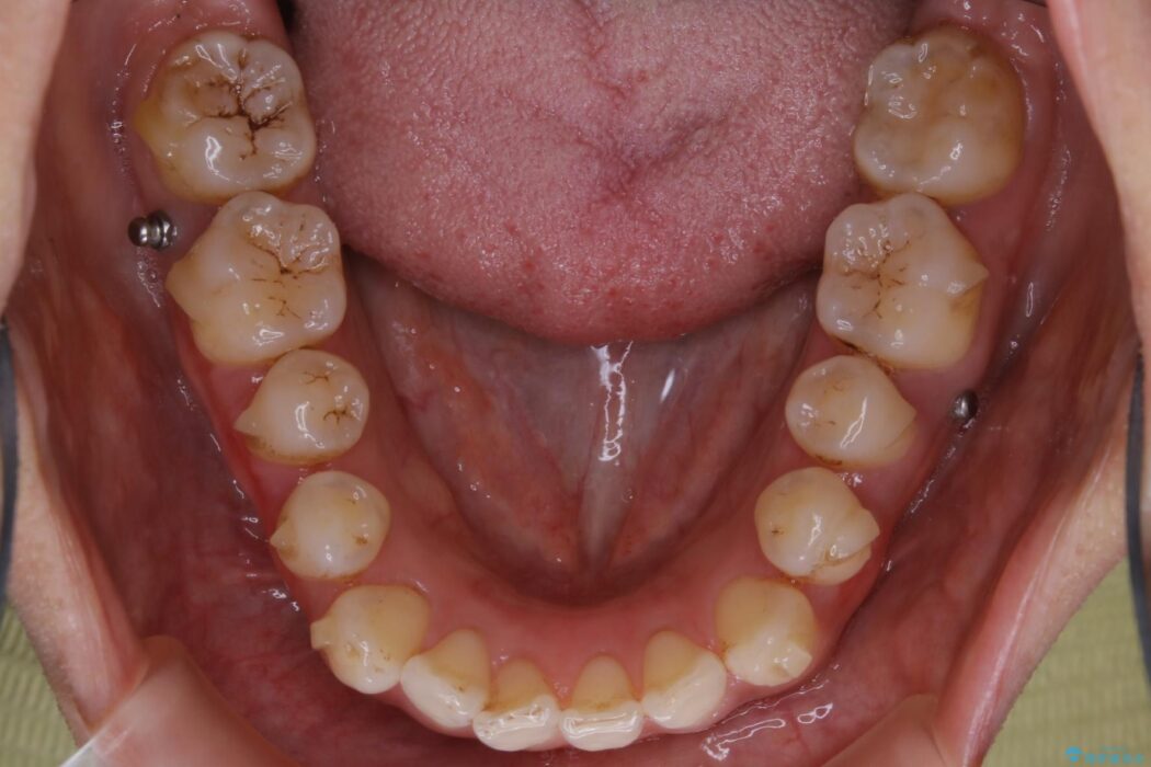 マウスピースとマイクロインプラントの併用により矯正するための隙間を確保し、治療期間は長くなりますが非抜歯できれいな歯列弓を得ることができます。