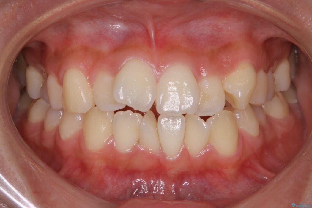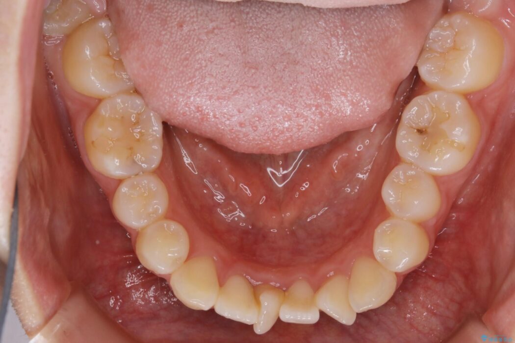 特に前歯部分に90度近く捻転した歯、斜めに生えている歯などによる歯列のがたつき、正中のズレが目立っていました。