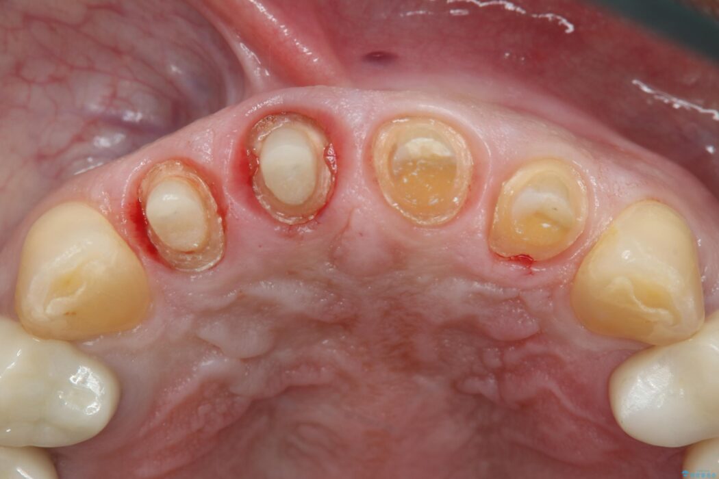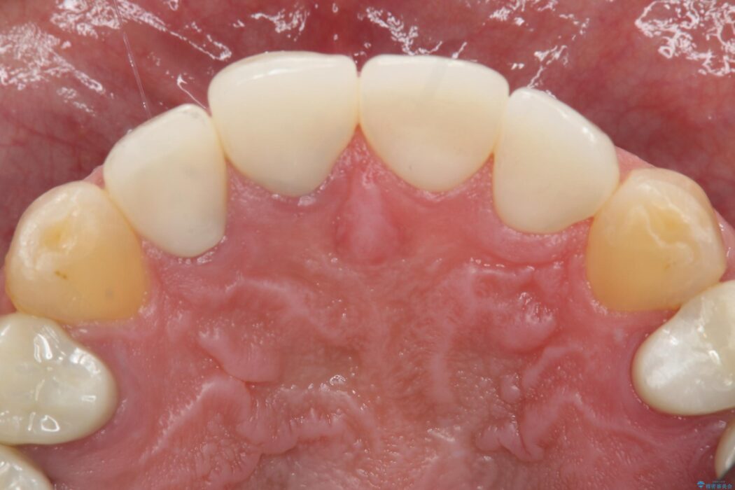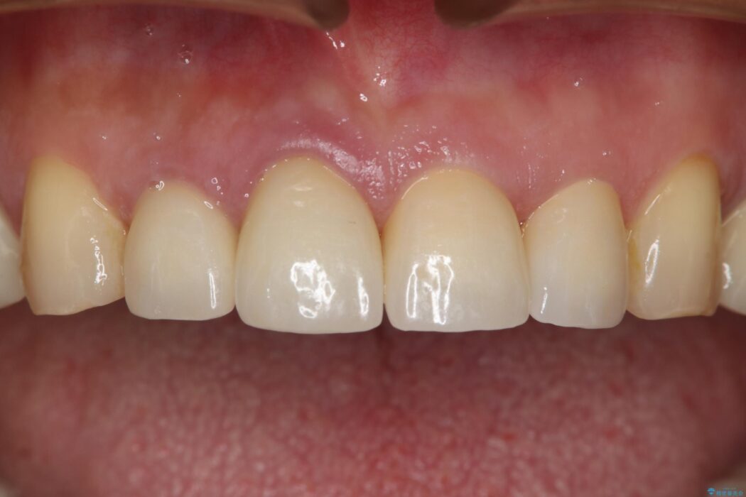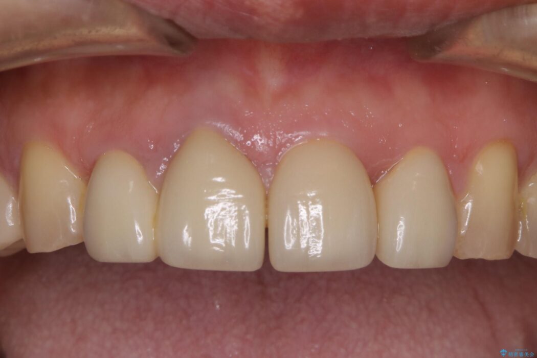 神経を抜いた右上2番の歯は、根の先の病巣を治療してから土台と被せ物を作製しました。一方、右上1番は、深く大きな金属の土台が被せ物の色に悪影響を与えていました。除去のリスクを避けるため、金属土台を一部残し、色の影響が少ないファイバーコア(白い土台)で補強と審美性の改善を行いました。